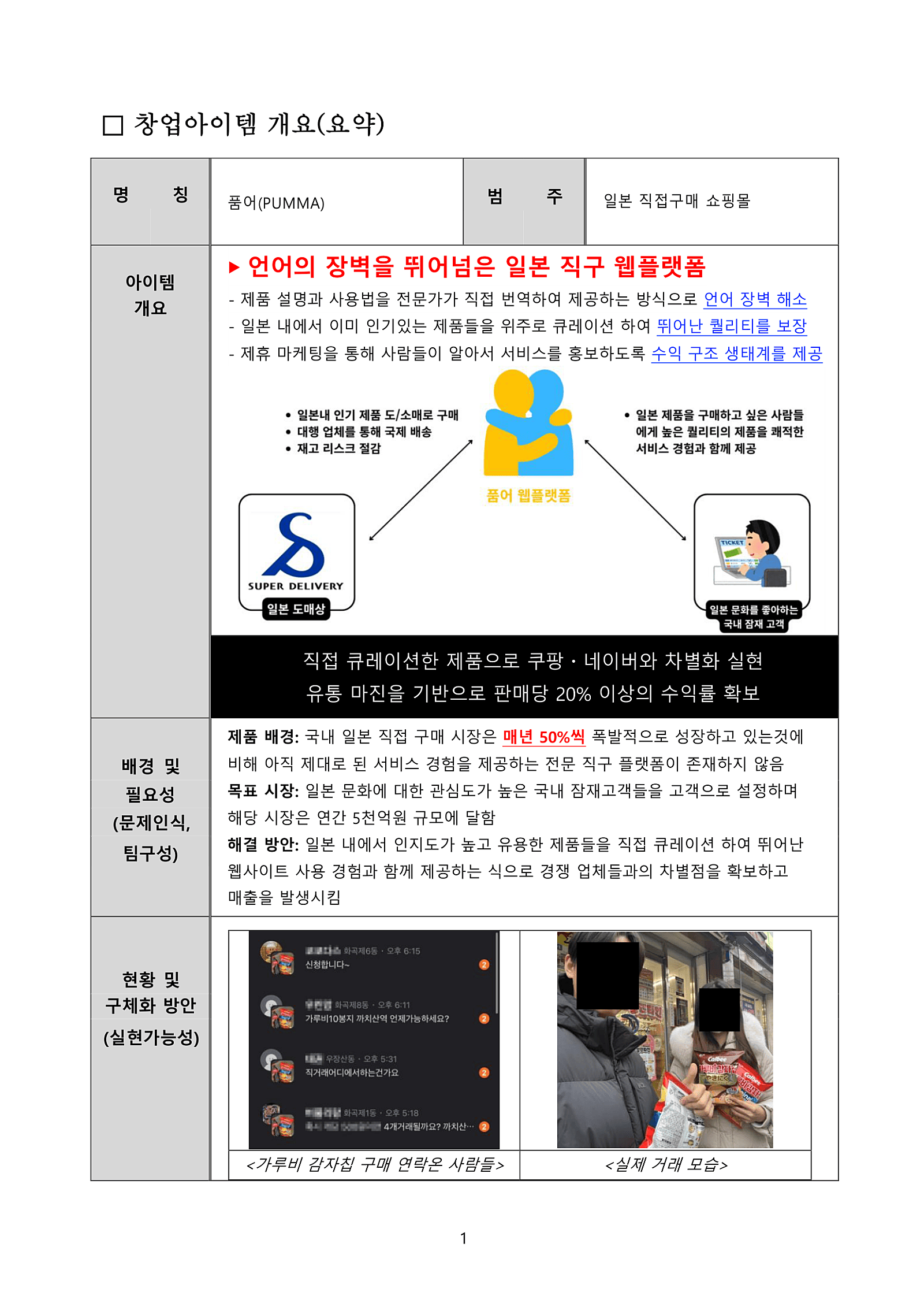 뭐 사업 선정 안된 사람의 사업계획서이지만, 작성하는 과정에 있어서는 최대한 많은 선배 기업들의 자료를 보고 직접 첨삭을 하나하나 받으며 만든 자료이기 때문에 참고 정도는 될지도 모르니 공개하고자 한다. 사업판에 뛰어드는 사람들에게 나름대로 이 글이 도움이 되었으면 한다.